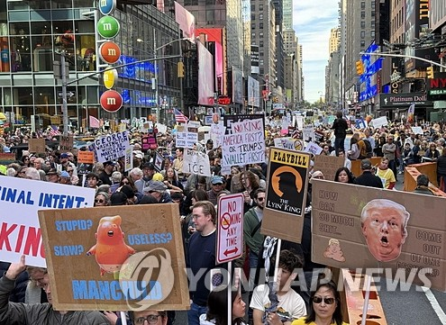 미국 백성들이 왕을 원하지 않는다는 피켓을 들고 거리에서 시위를 하는 동안