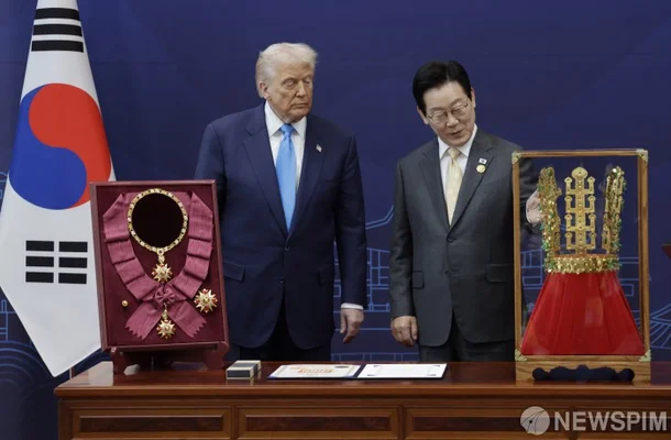 그때에 한국 이재명 대통령이 트럼프에게 신라 왕관과 한국 무궁화 훈장을 선물했습니다