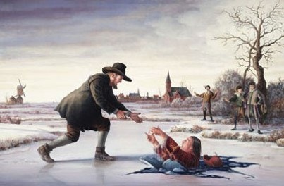 그림을 설명하자면 얼어있는 강을 건너다가 얼음이 깨어져 빠져 버린 사람은 경찰이며