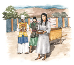 - 남편이 아내를 위한 보리 가루 준비하여 제사장에게 데려감